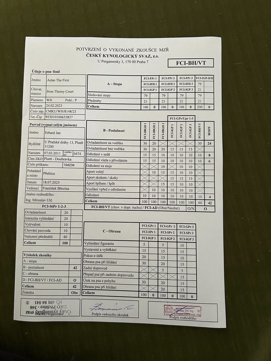 Aslan The First from Thorny Court si složil svoji první zkoušku z výkonu a to FCI-BH/VT!