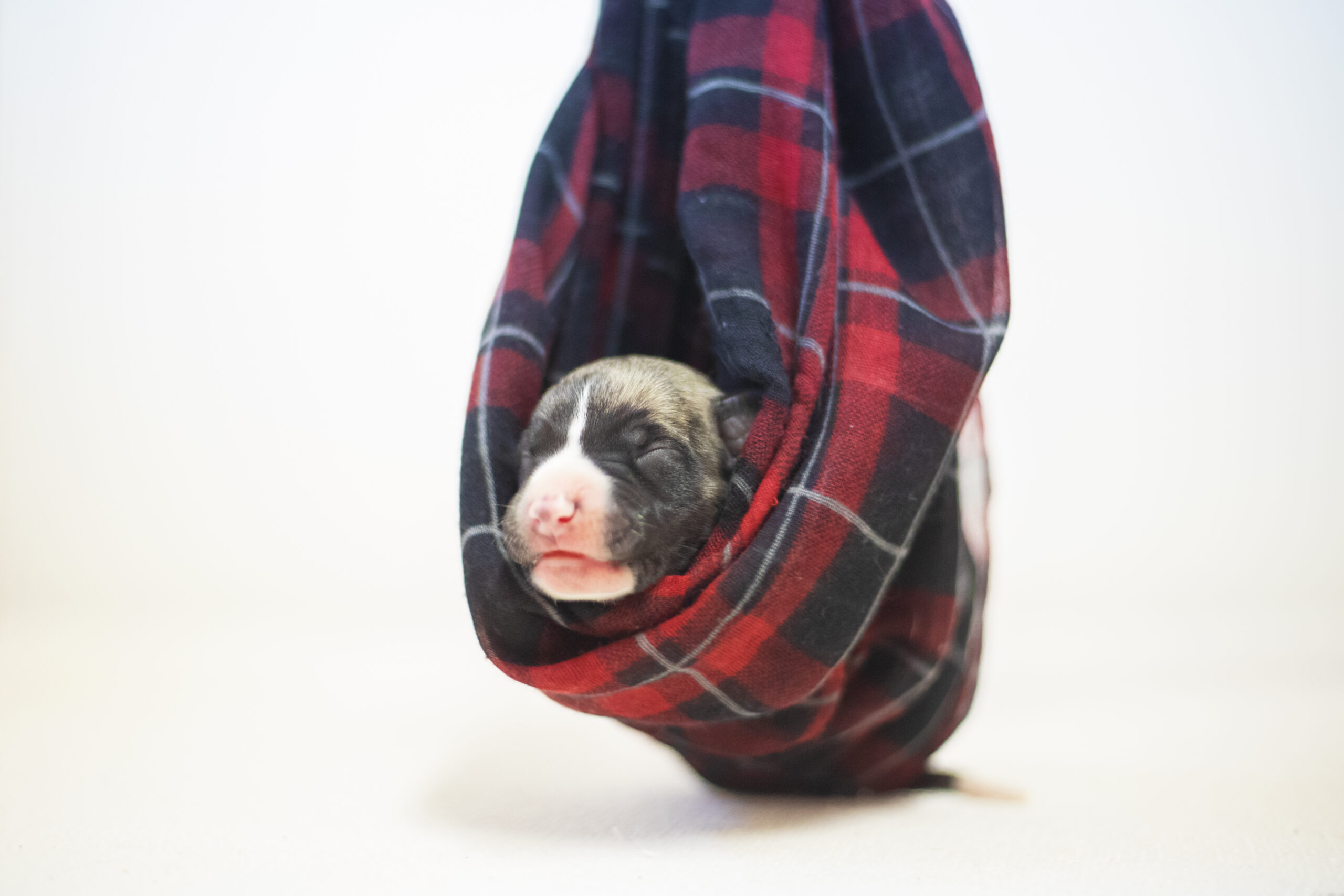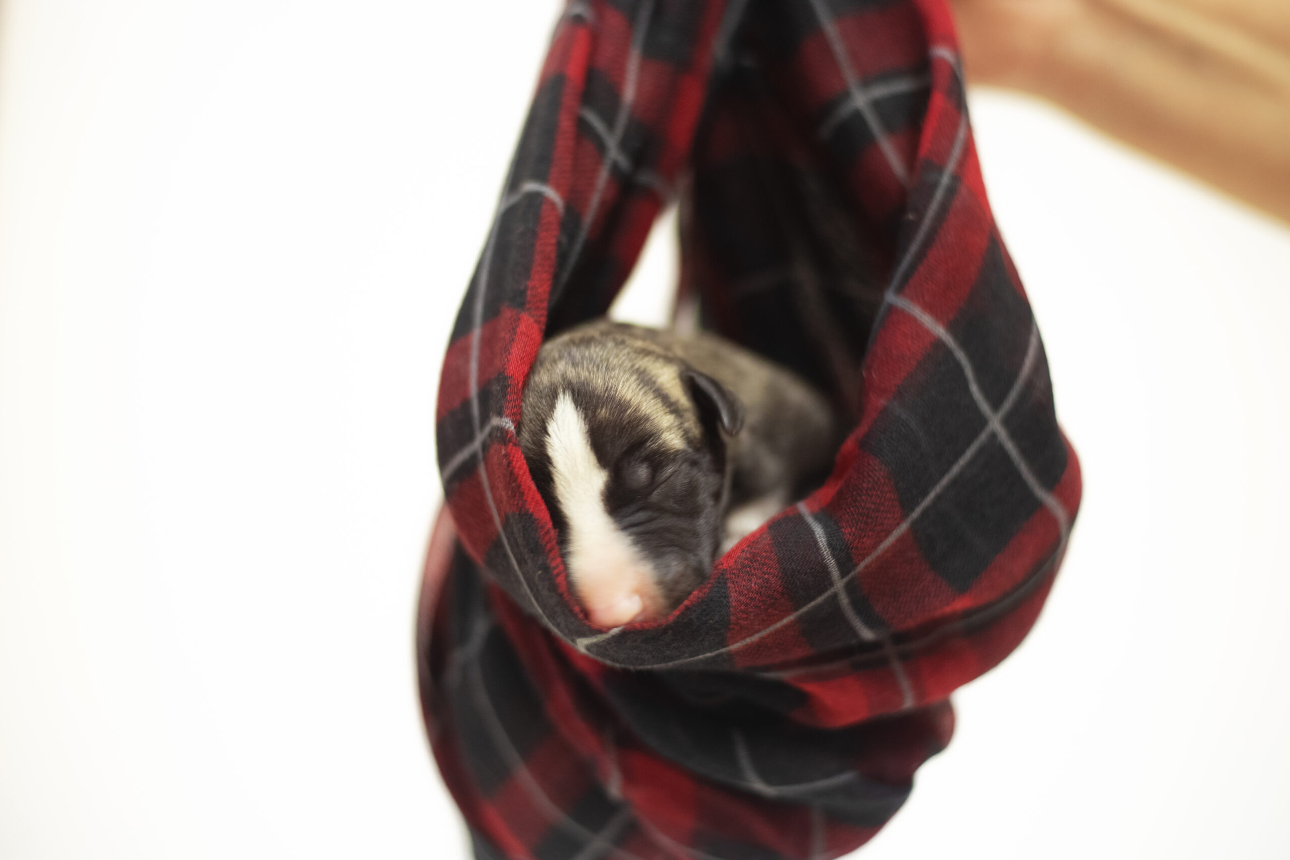 Od narození největší štěně, tmavě žíhaný pejsek s bílými znaky. Sebevědomý, prosadí se i díky své váze z vrhu nejvíce, všude by byl nejradši první. Rád aportuje a vyhledává kontakt.