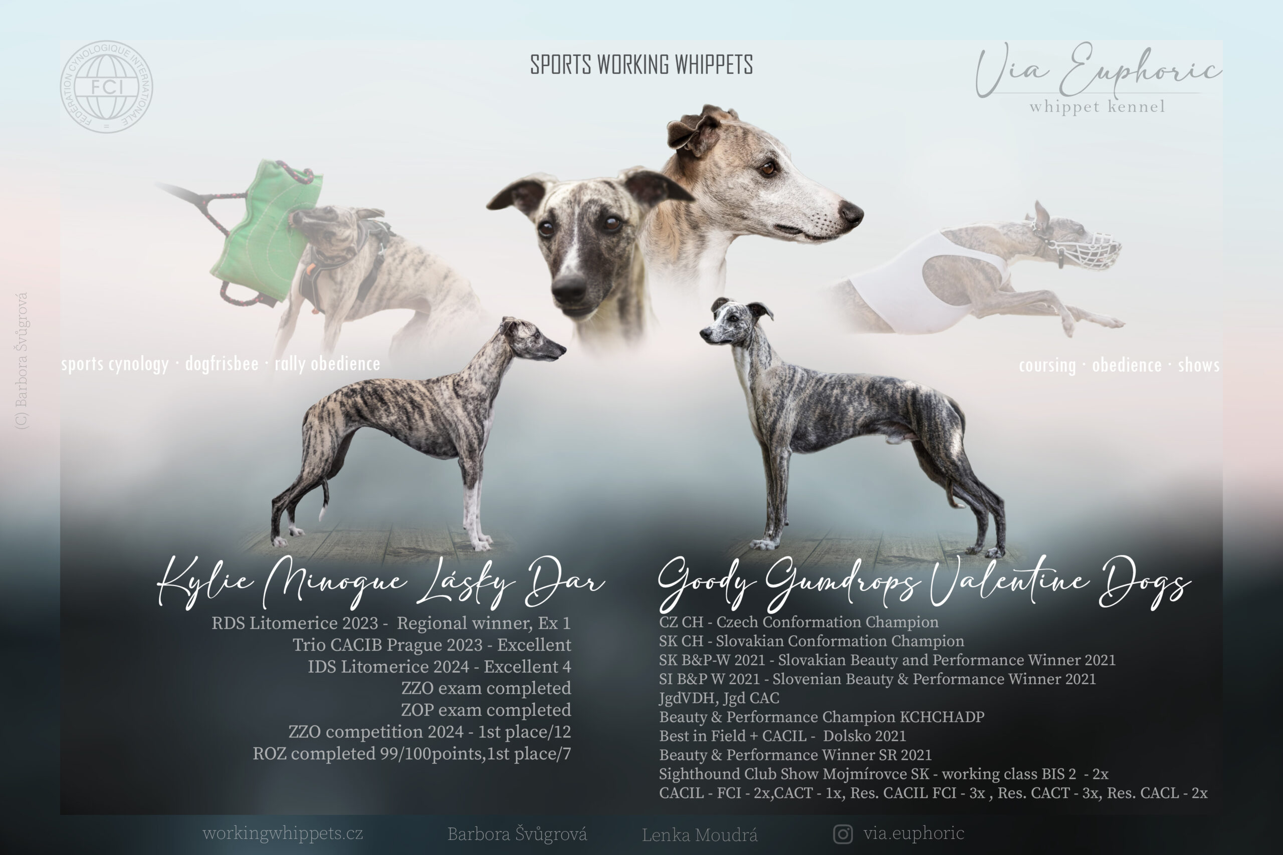 Goody je nejen krásný, ale hlavně velmi schopný pes. Při coursingu, kterému se především věnuje, nevybočuje a je sebevědomý na dráze. Jedná se o srdnatého psa, který se dále věnuje poslušnosti a je v přípravě na BH-VT. Vše, co dělá, dělá srdcem pro svého pána