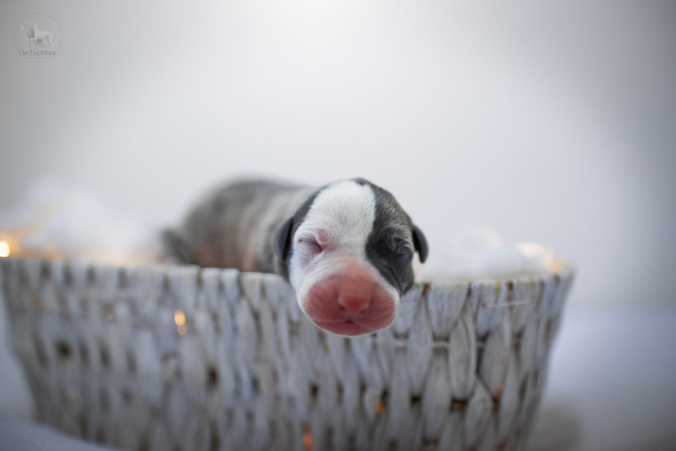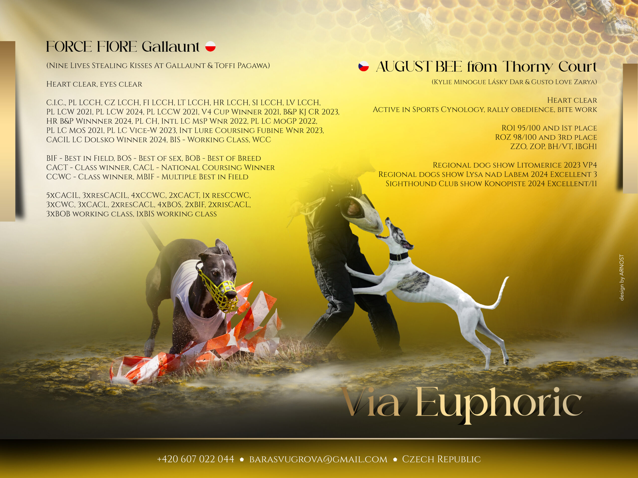 Otec Fiore je definicí všech titulů, jenž má na svém kontě. Nejenom, že se jedná o evropského multichampiona v coursingu, bavíme se o dominantním psu s velmi sebevědomou povahou a se silnými ochranářskými pudy. Dominuje drivem na hračky a na práci.